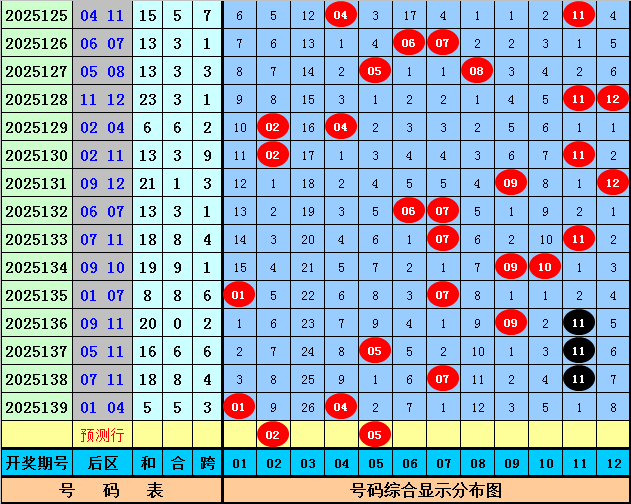 三少第2025140期体彩大乐透后区余数分析:上期后区开出奖号01和04,为全1路余数奖号,本期后区摒除0路余数号码,五码参考02、05、07、09、11。